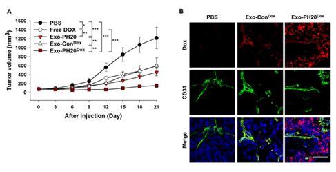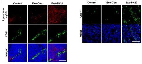 효소 엑소좀은 암세포 성장의 지지기반을 무너뜨려, 암 성장 저해를 유도하였다. 또한 연구진은 효소 엑소좀에 의해 암세포 장벽이 무너지면, 면역세포가 암 조직 내로 침투하는 정도가 향상되며, 항암제(독소루비신)가 암 세포 깊숙이 전달되어 항암 효과를 상승시킬 수 있음을 확인.